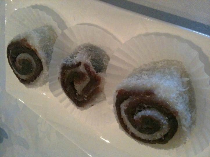 • RICE BASED CAKES – these can come in many forms. One variation is a hard, solidifed rice-based jelly. The more commonly-seen version is presented as a Swiss-roll-style or as balls injected with subtly sweet pastes of black sesame, red bean or pandan cream. Sometimes, these cakes are dusted with desiccated coconut or crushed peanuts. They are a Southern Chinese version of Japanese mochi, but with a softer, less chewy texture. The purpose of these types of desserts are not to end the meal on a sweet note, but rather to ensure that one has no more stomach space left. 😛
