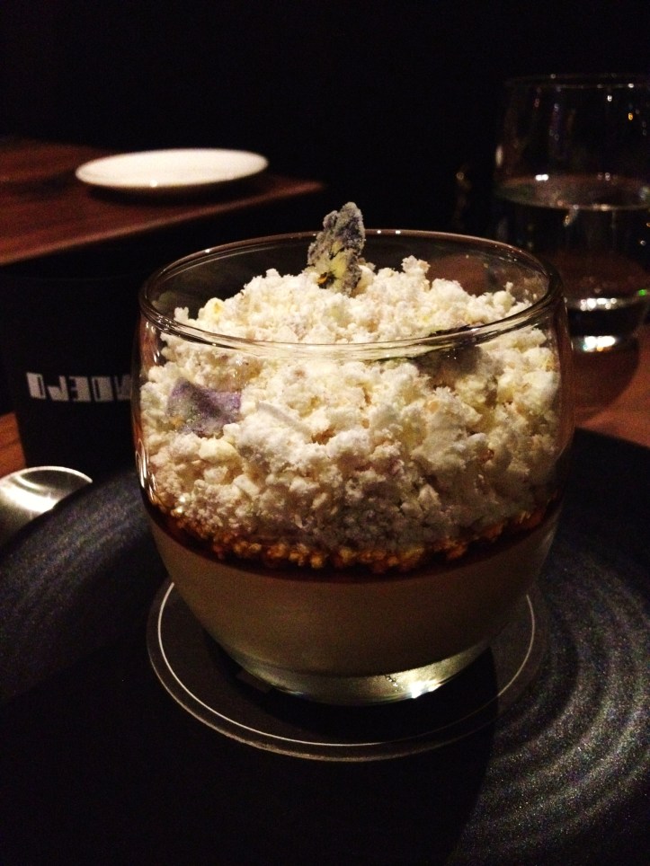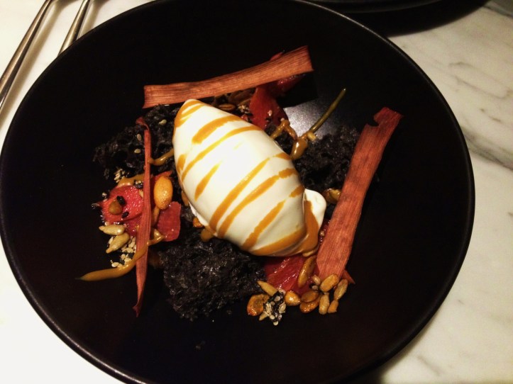 The second irresistible was the “Vialoni Nano Rice Icecream” ($17). Forgive us but it looked like the thorax of an albino bumble-bee on a bed of nettles. Encircled by caramel stripes, the centre-piece of rice icecream was embedded with soft rice grains and possessed a slight raw, milky flavour. It was wreathed by a dry nest of black sesame sponge (not the first time we have seen this strange unearthly creation, see here), and twigs of freeze-dried and fresh rhubarb. Incorporating therefore both Eastern and Western ingredients, emphatic textures and vague flavours, it was a dessert made for contemplation. A contemporary dance work.
