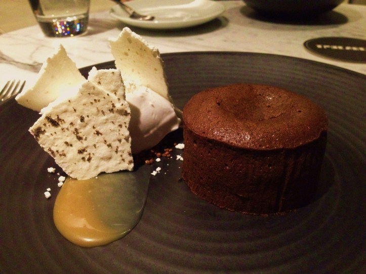 There are five sweet irresistibles offered at Trocadero. Bypassing the more conservative options of tarte tartin and madeleines, and a dessert special which wasn’t much to write about, the first irresistible sampled was the “Caramel Cooked Cream” ($16) — a tumbler of something somewhere between panna cotta, creme caramel and custard. This was the opera of desserts – rambunctious, flamboyant, it did not waste time with subtlety. A hint of pear in the custard was quickly overwhelmed by an explosion of freshly-popped white popcorn, a fat layer of cream and hidden thick swirls of chocolate and teeth-sticking salted caramel. Recommended only for the most serious and insatiable of sweet-tooths, this was very sweet even for these Dessert Correspondents penning this dessert-only blog.
