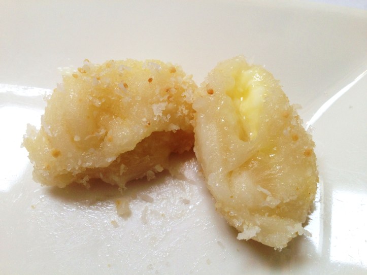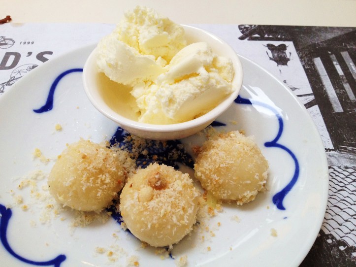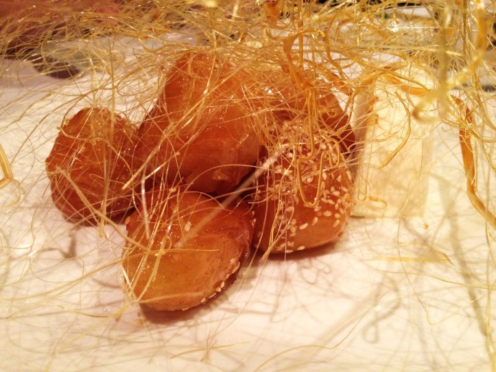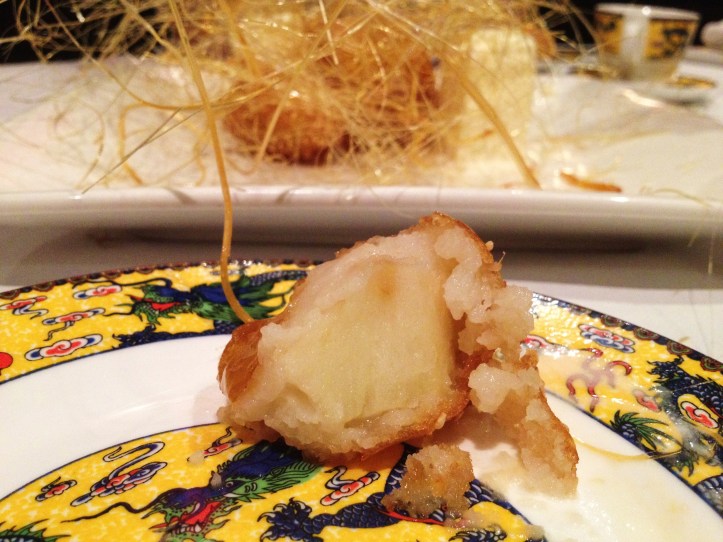 MoMo & Coco usually bypass desserts in Chinese restaurants in Melbourne because of their strange insistence to offer bastardized, underwhelming iterations of traditional Chinese desserts. This is not the case at Quanjude. Dear readers, allow your Dessert Correspondents to introduce….the “Peking Toffee Apple” ($16). It doesn’t look like much at all, you are saying. But beneath a playful sticky web of carefully draped toffee were a tumble of golden nuggets. One first has to appreciate the supersonic speed which the chef must work in order to create this thin toffee nest before it solidifies. One then has to appreciate the equal care taken in steeping in the apple bites so that they are coated not in deep flour crusts, but rather laser-thin encasings and quickly rolled in syrupy honey and toffee. This is undoubtedly, a dessert to give your dentist nightmares, but oh my, what a dream of a dessert for sweet teeth that yearn to finish a Chinese banquet properly! Be warned, ladies, watch your hair while eating this! One of us became a little golden blonde for a bit.