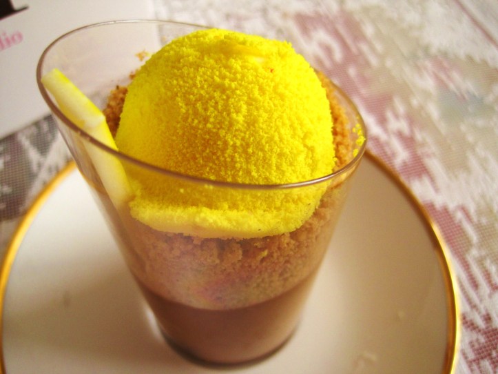For the third dessert tube, we opted to introduce the “Explosive Raspberry Milk Chocolate” ($9). According to its label, its elements included “raspberry and milk chocolate mousse, raspberry custard, raspberry compote, explosive milk choc chip, cookie crumb, exaggerated raspberry cream, raspberry marshmallow and milk chocolate mirror glaze.” This dessert tube was the most disappointing of the quartet selected from Burch & Purchese. There was a meringue droplet, but it was hardly explosive in flavour strength, nor did we perceive any popping candy. Yes, it looked like and tasted like a molecularly reconfigured raspberry.