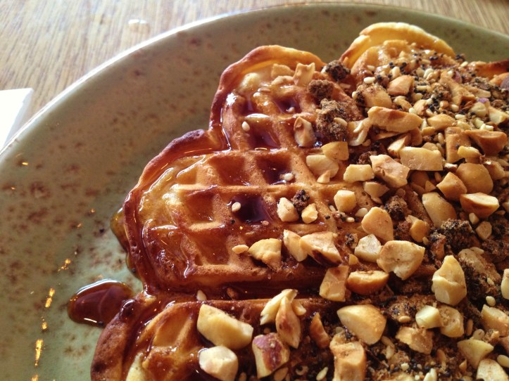 Fact: cafes open in Melbourne more frequently than the sun shines. Fiction: all Melbourne cafes are fabulous. Hoards will run to the newest cafe on the block, but more often than not, the “new” is offering the “same old, same old.” Different location, different name, same same same. Not so, at the Stovetop, a recent opening near Melbourne University, just at the border of the CBD. Order the Waffles ($13). Metaphorically, it’s one gorgeous super-sized flower, guaranteed to brighten up your day. Actually, two waffles sandwiching a creamy swathe of orange-scented vanilla bean custard. Top-it off with a blanket of nuts and cinnamon and dukkah. D-e-f-r-e-a-k-i-n-g-l-i-c-i-o-u-s. We will let the pictures do the talking!