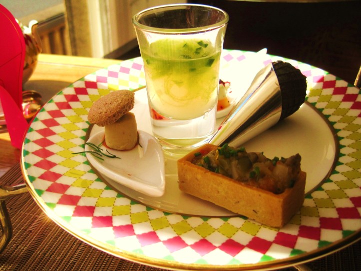 Afternoon tea at The Berkeley in genteel Belgravia/Knightsbridge, London, is held within the confines the Caramel Room on the ground floor of the hotel. The atmosphere is refined, though bustling because of the somewhat closely-spaced tables. We recommend trying to reserve a table near the window, for greater privacy and intimacy. There maybe a lot of service staff, but they aren’t quite on par with their surveillance duties. On our visit, it took some very determined, somewhat embarassing hand waves to beckon them. The dining ware is striking, a tessellated pattern of green, yellow, white and pink diamonds. The tea menu is divided into traditional loose-leaf teas served in traditional tea pots and tea saucers, and infusions that arrive in tall glasses. Absolutely, go for the infusions!