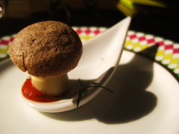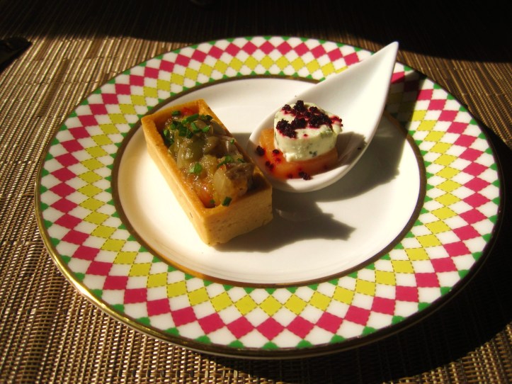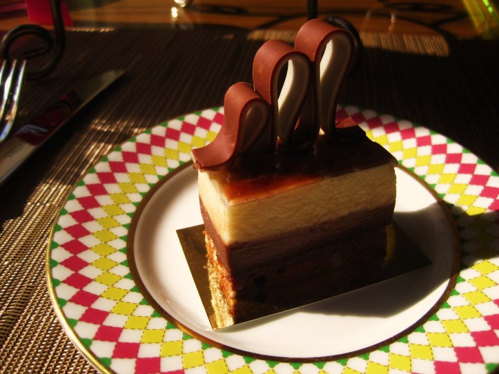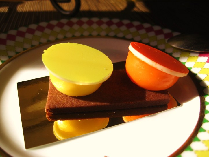 On this tier, the first sweet irresistible to be sampled was a creation inspired by the popping block colours of a typical Jonathan Saunders dress. At the Berkeley, the chefs had interpreted this designer into a chocolate short bread biscuit embellished with two white chocolate domes infused with lemon and orange blossom respectively.