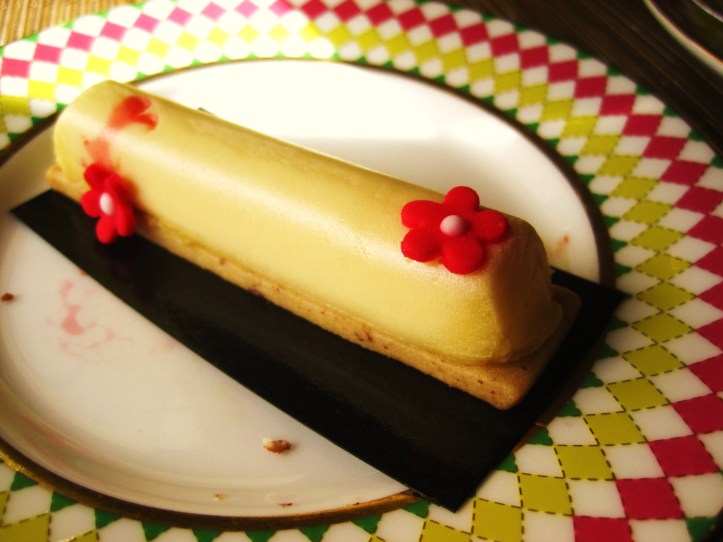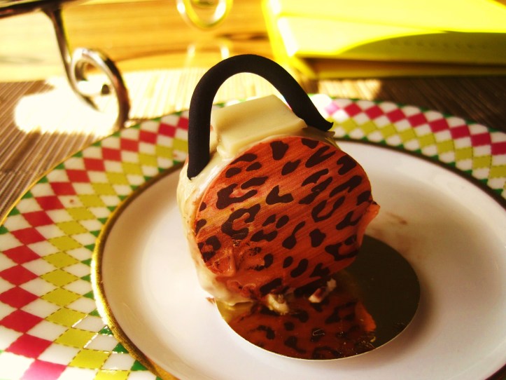 The second creation was inspired by Prada‘s typical sleek elegance, a log of Grand Marnier white chocolate set on a biscuit base and embellished with hard iced, red petite fleurs.