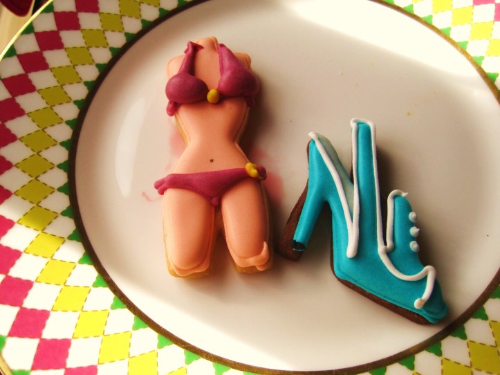 And just for nibbles, who can resist the following? Try to think away thoughts of your now inflated stomach as you munch on the toned dimensions of the Tory Burch bikini biscuit. And now completely satisfied, strut out of the Berkeley with a last gobble of the Manolo Blahnik high heel biscuit…even if you are wearing a pair of Louboutins or Jimmy Choos yourself, or perhaps something a little more high street, a little less couture. 🙂