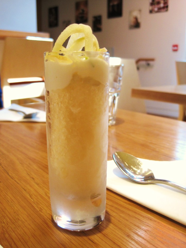 On our visit a few months back (yes, terrible, we have a terrible backlog of incredible dessert reviews coming!), the first course sent out by the dessert bar was the “Apple and Brandy Granita.” A little shot glass of icy shaved ice spiked with brandy, spliced with yogurt, and embellished with a curl of granny smith apple. Slightly sweet, an appetiser that served to cleanse and refresh the palate right away.