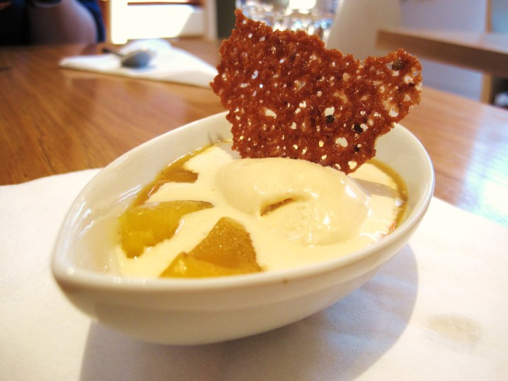 The second course was the “Miso and White Chocolate Ice Cream” — or as it turned out that hot London summer day, white chocolate ice cream tinged with a lightly strange taste (but not perceptibly miso), melting into a liquid blanket on retirement-village-soft stewed apricot. Not the best dessert in the world, one has to be honest. The caramelised sesame toffee brittle was presumably meant to add textural contrast, but failed to uplift the soggy dish.