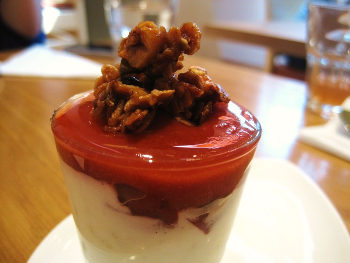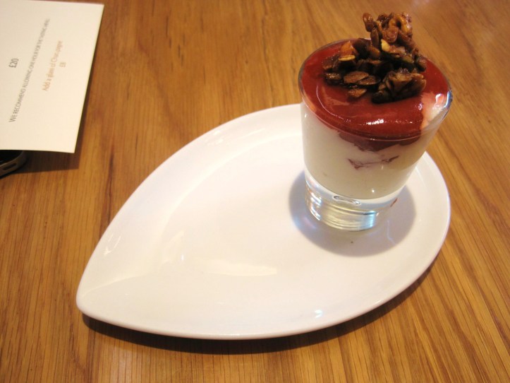 The third course was quintessentially British pudding — “Vanilla Rice Pudding” was layered with a tangy rhubarb compote, cubes of light-as-air elderflower jelly and a granola knob. These Dessert Correspondents quite liked it, but our dining companion struggled to distinguish it from say, a breakfast yogurt pot. Oops!