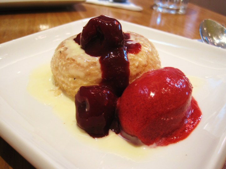 The fourth course was one of the most disappointing desserts we have ever had. A savarin is almost akin to rum baba — this one however tasted like a stale croissant/doughnut thing. Chewy, soggy. What a waste of carbohydrates. The one great thing was the zinging raspberry sorbet.