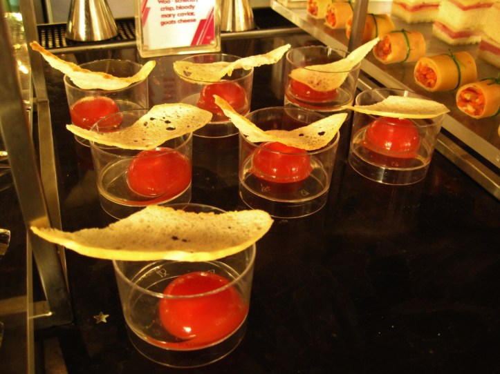 - “Woo-schetta” of bloody mary cavia and goats cheese on a crisp