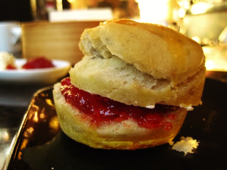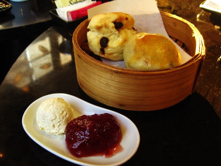 As an intermission, scones were served piping warm in a dim sum basket! The jam however was slightly bland, though the cream had the right consistency with a bit of naughty, being swirled with white chocolate!
