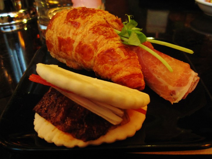 Without further ado, let’s proceed. The menu is presented as a black and hot pink list of 18 savoury items and 12 sweet items. It’s the former, rather than the latter, that are the show stoppers of this afternoon tea. You eat from palm-sized, square black plates, which is both a positive and a negative. Firstly, you don’t feel like such a piggy because your little plate can only load up 2-3 items from the buffet stands at any one time. However, you eventually end up with a veritable tower of black plates…that take a little while to clear as the service staff are not particularly efficient nor observant. In any case, an afternoon tea buffet is pure fun, so who really cares about silver service?