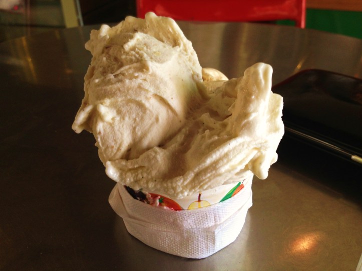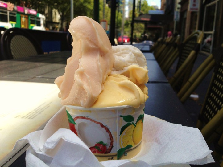 Have you been to Milan before, readers? Unlike Rome, Florence and Venice, it isn’t a usual destination for most tourists unless one is a banker, a fashionista, a fashionista with a banker, or a banker with a fashionista tendency. Yet, it was in Milan that these Dessert Correspondents found, among other things, a sudden fascination with  gelato. The unattractively-named Grom was the gelato shop that we  fell head over heels in love with, even more so than the financial crisis-inducing heels just purchased at La Rinascente. With one hand occupied with shopping bags, and the other with a cup of Grom gelato, blissful contentment was guaranteed. Fast forward two years since that very first trip to Milan, and a gelateria sprung up on Melbourne’s Spring Street at the first breath of summer in late 2012,. Thankfully, despite the volatility of Melbourne’s food scene that has seen a high number of “crash and burn” food ventures in the past months, Spring St Grocer’s Gelateria Primaveria continues to do a brisk trade this hot summer. A neon light  is a beacon to office workers, theatre-goers and the general populace day and night. Beyond a short flight of stairs, a red marble bench studded with silver lids and a long scroll of butcher’s paper is scrawled with a weekly rotation of ice cream flavours. It triggers curiosity. What lies beneath, you ask? For $4.50 for one scoop and $6.50 for a holy trinity, you call out your choice of flavours, they whip off a silver lid, scoop up from the icy depths a soft mound, sculpt it with the care of an artist into a shallow paper cup. With one hand, you pass a handful of coins, and with the other, you make a greedy grab for the paper cup. You spoon a little pedal-spoon into your mouth, you close your eyes and Melbourne disappears. It’s a melting moment.