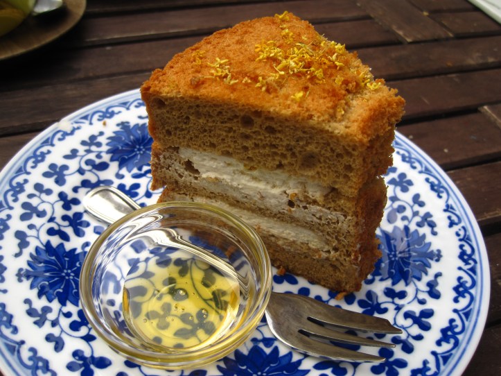 The “Osmanthus & Okinawa Black Sugar Chiffon Cake” (approx HKD $45) is another gorgeous thing — for the expatriate tired of soft Cantonese bread/cakes, this is a real cake, but with oriental flavours. Perfect. The light chrysanthemum tones that flutter with each bite calls for you to order a whole cake for your family home, especially that wizened old grandmama.