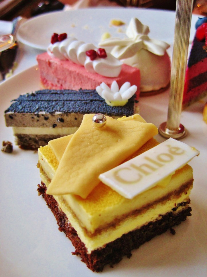 Hello readers, these Dessert Correspondents continue to break our rules and fail to correspond on our promised weekly basis. We do apologise. We write from Hong Kong and continue our series of summer dessert escapades from a summer that knows no ends. This summer, one of those “high tea establishments” on the Island side, the Mandarin Oriental’s Clipper Lounge, is hosting a special fashion-themed afternoon tea and artwork exhibition in celebration with the recent launch of “Chloé Attitudes“, apparently the first book on the history of this fashion house from 1952 up to the present day. Having fallen in love with fashion-themed high teas such as London’s Pret-a-portea at the so-very-posh Berkeley, the Churchill’s Sex and the City Part-Tea and Melbourne’s annual L’heure du The organized by the lovely Francophile Le Style, these Dessert Correspondents simply could not, not go to Clipper Lounge’s interpretation of a fashion-themed high tea. The Clipper Lounge is located one floor above ground level, and is essentially an upper-level enclosure looking downwards on the ground-level lobby. Aside from the grand crystal lighting that cascades like a glittery waterfall at eye-level, the Clipper Lounge is not a place for the incredible skyscraper skyline. The ambience of the lounge is unmistakable hotel.