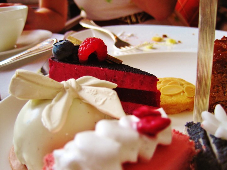 We saved our stomach spaces for the three-tier, which was reversed in order, with savouries crowning the arrangement and the sweets at the bottom. There were three types of sandwiches (salmon and cream cheese on pumperknickle, ham and pungent mustard, and cucumber wrapping white bread that enclosed egg mayonnaise), and two types of savouries (a tiny quiche and what seemed like a hybrid between a frittata and jaffle-sandwich).