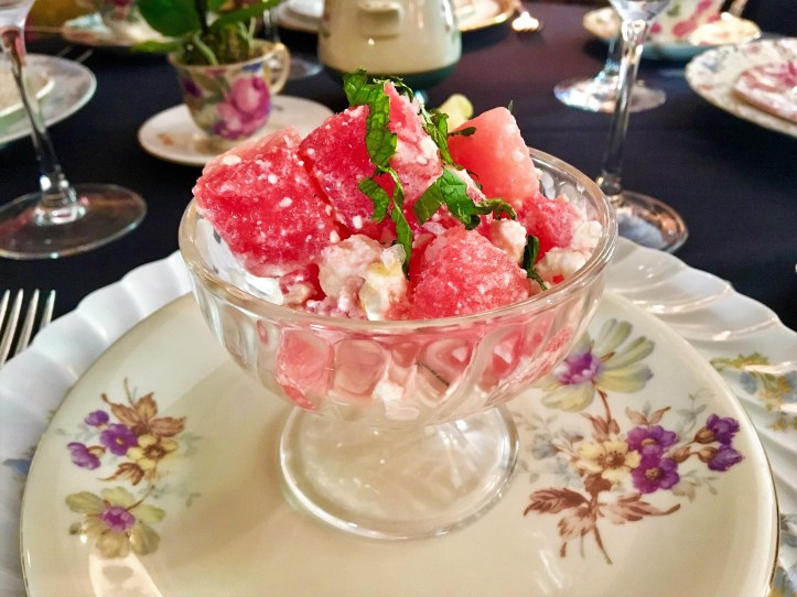On our visit, tea was limited to a handful of flavours, of which we selected lemon verbena and the fruity lychee red tea. However, one was given the opportunity to sample more than one tea during the course of the afternoon, which was very welcome. The food was overall, somewhat uninspired. The highlight was probably the first course, a crystal bowl of refreshing watermelon salad, which we understand, switches to a comforting butternut squash soup with the changing seasons. This was followed by a plate of forgettable ribbon cut sandwiches, of which the open-face option layered with slivers of butternut squash was the most delicious. Then, piping-hot scones served with pots of clotted cream and strawberry jam. Desserts included a creamy slice of Lady M’s signature multi-layered crepe cake, and a platter of dainty sweet bites (macarons, brownie bits, and chocolate-dipped strawberries).