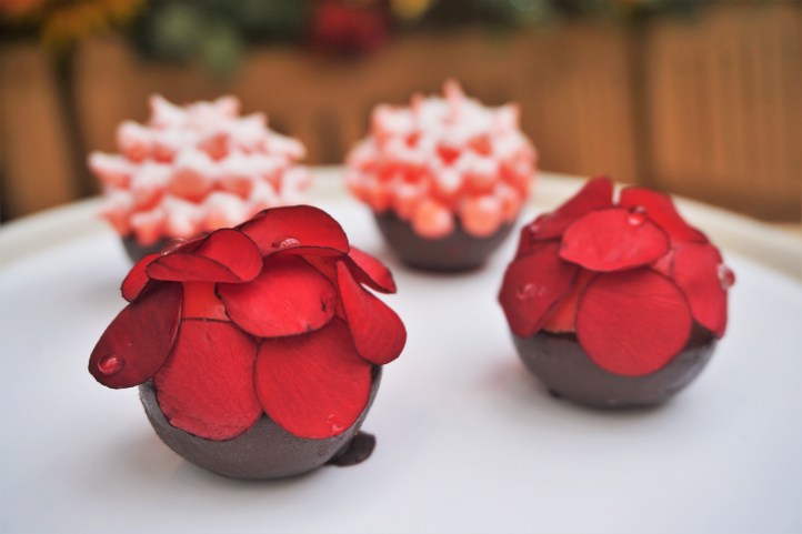 By reservation only, afternoon tea takes place in the backyard terrace of the sweet boutique. Draped with waterfalls of blooms, it’s a cute casual and carefree environment, rather than rarefied hotel-like. Tea selection was limited; we selected Earl Grey as our traditional go-tea. Savoury bites numbered five in total, and sweet nibbles numbered four. You protest, that’s all?! Fear not, dear readers, you will look and feel as round as a cream-filled cronut by the end of this afternoon tea experience. For the first savoury nibble, the so-called “Seed” was a black choux pastry ball filled with wild mushroom, confit garlic and pumpkin seed. This was followed by the “Shoot”, another black ball wearing an avocado hat, and accented with green chilli and coriander. The “Young Leaf” wore a pretty headpiece of thinly-sliced cucumbers, encasing smoked salmon and cream cheese. We skipped the “Full Leaf” due to an allergy, but the “Fallen Leaf” was an orb of steak tartare embellished with a radish fascinator.
