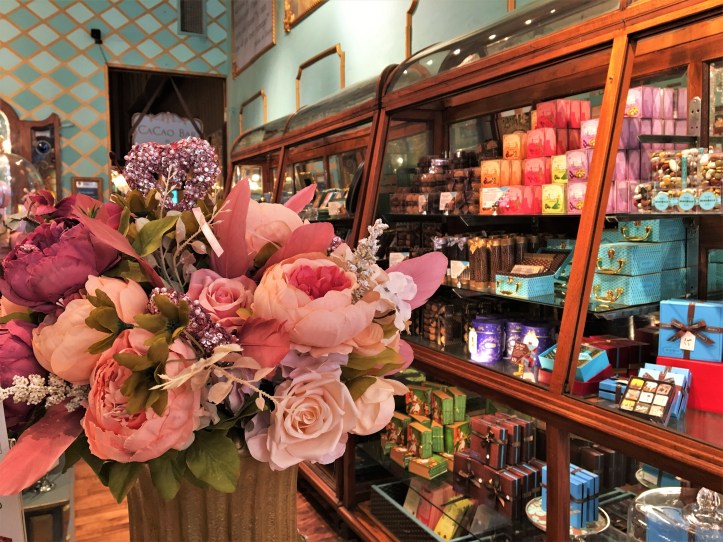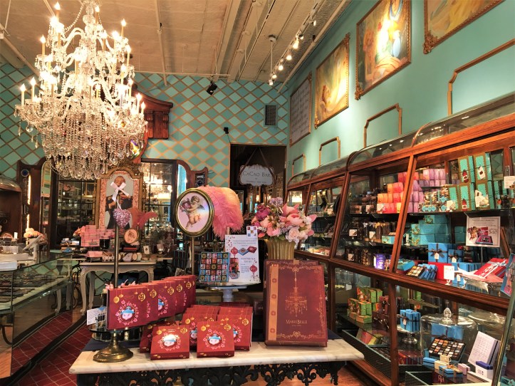 Nestled away from the artery of Broadway that runs through Soho – New York’s downtown shopping district – is a tiny chocolate sanctuary in the style of an Old European salon de thé. The last time that these Dessert Correspondents encountered such a sumptuously-decorated afternoon tea venue was Mamor in Melbourne. Stepping into MarieBelle is akin to not only stepping into a place so seemingly far removed from New York and its street cacophony of car honks and emergency sirens blaring every few minutes, but also stepping into a bygone era – one of glistening chandeliers, walls panelled, painted and papered, vases festooned with cheeky feather sprays and sparkling ornaments, and shimmering mirrored glass shelves of chocolate. And gosh, sniff that chocolate fragrance! There are chocolate bars, chocolate truffles, confectionery rocks and even a chocolate ganache cake encased in a book-shaped gift box. And not just any chocolate – MarieBelle is one of the rare, and very few, bean-to-bar manufacturers in New York, with its chocolate made from “single origin Cacao Trinitario” bean grown on Honduran plantations.