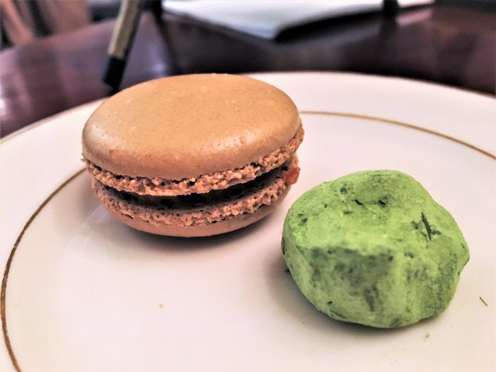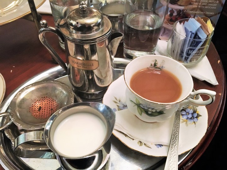 Afternoon tea at MarieBelle takes place at the back of the chocolate store, in a small area of closely-spaced, tiny marble-topped tables, dark bamboo-cane chairs and old gilt mirrors. On our visit, high tea was presented in the traditional three-tier format, with gold-rimmed plates, proper silver teapots, and delicate transfer-painted floral porcelain tea-cups and tea-plates. There were eight varieties of tea from which to choose, and of which we selected the English Breakfast and the Lychee Black Tea. Afternoon tea at MarieBelle also came with a choice of hot (or iced chocolate), which was the highlight of the afternoon, in fact. We highly recommend the “Milk Chocolate,” spiced with nutmeg and cinnamon. It was a deliciously creamy, ambrosial concoction — exactly how a hot chocolate should be. Come here for your hot chocolate fix, rather than the more “famous” City Bakery.