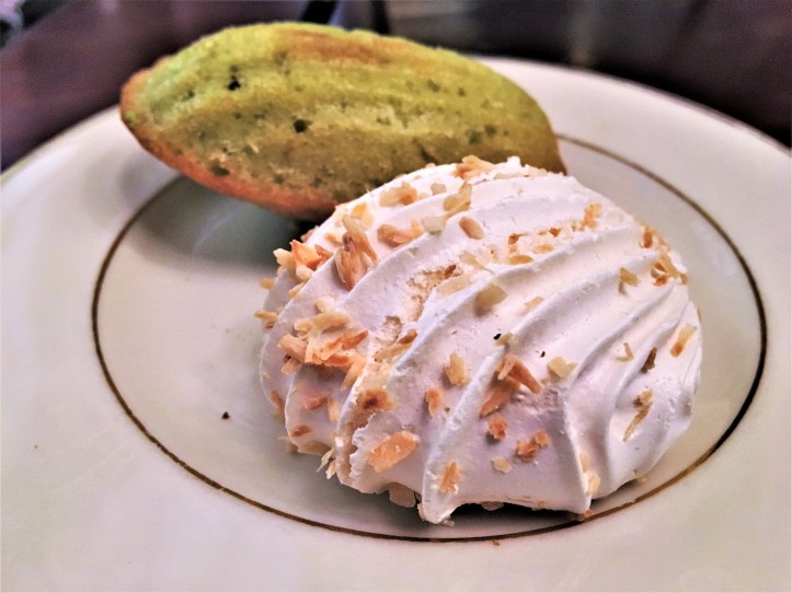 Sweet irresistibles comprised the two upper tiers of the high tea at MarieBelle. First, an assortment of a chocolate macaron, signature white chocolate truffle rolled and dusted in matcha powder, shell-shaped macaroon flecked with roasted coconut, and a classic madeleine cake infused with green tea. This was followed by a chocolate fondue into which we dipped banana slices, strawberry nibbles and blueberries frosted with icing sugar. Again, the chocolate was a highlight – a ramekin of simply luscious molten dark chocolate.