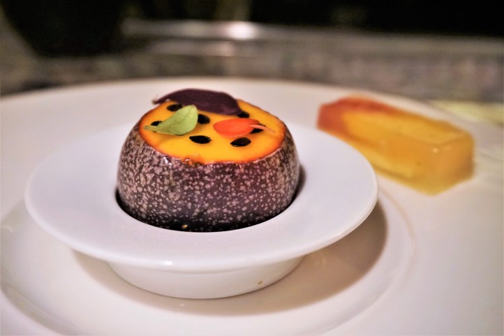 The first dessert course was a miniature cone of olive-oil ice cream, nitrogen-ice-smoked with the scent of lemon and pine. The second dessert course arrived in a beehive-shaped porcelain pot, inside which a creamy concoction of rice pudding was swirled with honey, honeycomb, pop rocks, and kumquats. The third course was probably our favourite of the evening – a passionfruit tromp l’oeil. Here, cheesecake was squeezed into the shell of a passionfruit, and infused with its tangy tones. It was accompanied with a hard jelly-like cake of sunset ombre hues. These Dessert Correspondents could not partake in the fourth course due to a food allergy, but our dessert companion did.