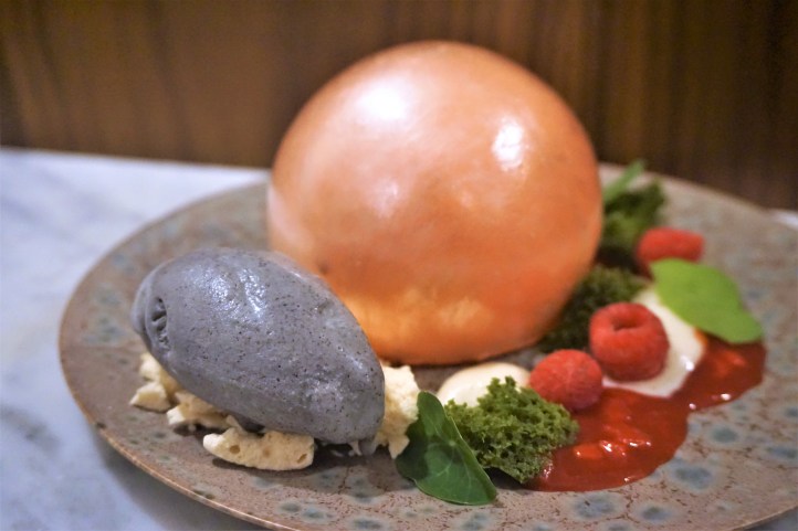 There are six desserts on Patisserie Fouet’s dessert bar menu, of which three are souffles. The dessert tasting commences with a little glass of pannacotta. A frozen grape sits inside, and textural contrast is provided by a black sesame crackle. The tasting ends with biscotti-like bites. The main course of the dessert tasting are the real showstoppers. Deserving a place of honour on any list of the most aesthetically beautiful (or most Instagrammable) dessert in New York, the “Yuzu Sugar Sugar” ($20) features a pearlescent pink shell mounted on a crystalline grey-green stoneware plate, like a treasure brought up from the depths of the mysterious sea. Once the outer shell is cracked, a garden bed of yuzu mousse, green tea sponge, yam and a quenelle of black sesame ice cream is revealed.