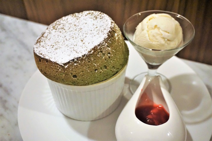 The third dessert that we sampled was a souffle, of which there are 3-4 flavoured varieties at any given time at Patisserie Fouet. On our visit, the “Green Tea Souffle” ($16) was a cloud-like confection with fairly keen, green tea tones. It was accompanied by vanilla bean ice cream, which seemed somewhat superfluous. Raspberry sorbet, or something more citric, would perhaps, have been a more creative counterpoint.