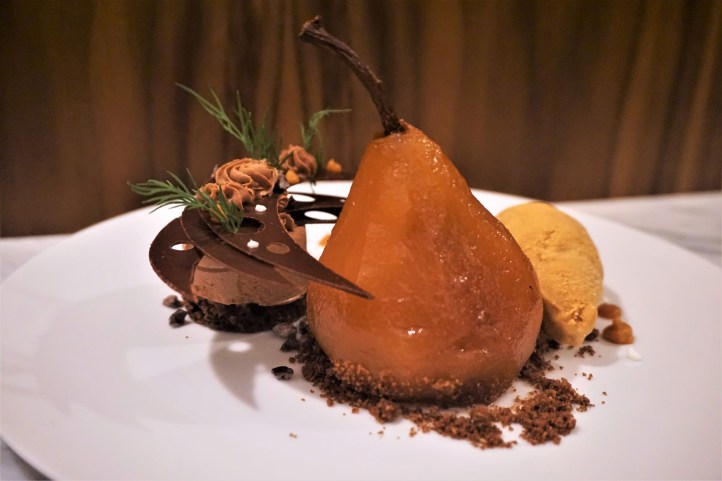 And finally, the “Pear Compote” ($20) wouldn’t look out of place in a fine-dining French or Italian restaurant. Curiously, despite the fruit theme, this dessert had a distinctively sweeter profile than the other desserts at Patisserie Fouet. Here, a poached pear was surrounded by variations of chocolate – a celestial, chocolate crescent moon sculpture layered with chocolate mousse, dots of caramel and chocolate, all accompanied with salted caramel ice cream.