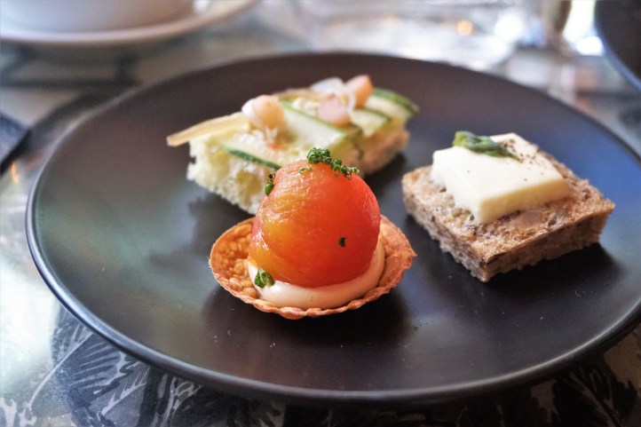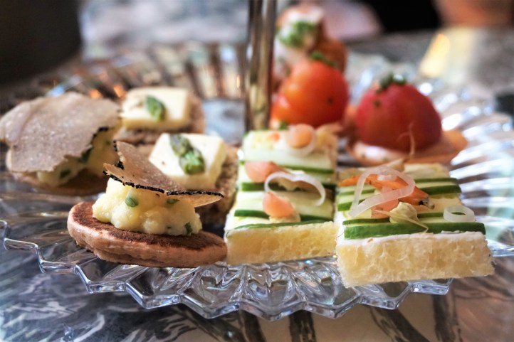 The sweet irresistibles of the afternoon tea were perched on the two remaining upper tiers of the crystal set. There was a bluebbery tartlette, another filled with a light apricot custard cream, and also a meringue vacherin embellished with a scoop of tiny diced strawberries. There was also a little choux pastry religieuse snowman, filled with lemon earl grey custard, and a pretty ombre-shade blood orange white chocolate mousse teardrop.