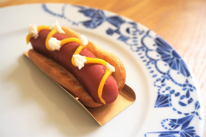 Resembling so very much an “everything bagel”, Dominique Ansel’s version of the “Everything Bagel & Schmear” was actually, a honey graham cracker-flavoured meringue bespeckled with sesame seed, poppy seed and toasted coconut. It sandwiched a chunky circle of cheese mousse with an inner tube of sour cherry jam. Crafted to resemble a pepperoni pizza slice, the “New York Slice” was a strawberry cheesecake-like creation, with thinly-sliced strawberries glazing the surface of a fromage blanc mousse. Its “crust” was a vanilla sable and its base was a kirsch-soaked almond biscuit. The “Pretzel” was a twist of peanut-butter-flavoured mousse, with slight caramel tones, and decorated with crunchy chocolate-coated pretzels at this base. The “Haute Dog” was perhaps the most mind-boggling, and life-like, of the trompe l’oeil dessert creations. When sliced, it still resembled a frankfurter…yet, one bite yielded raspberry mousse, passionfruit curd, and a “bun” of lady finger sponge cake.
