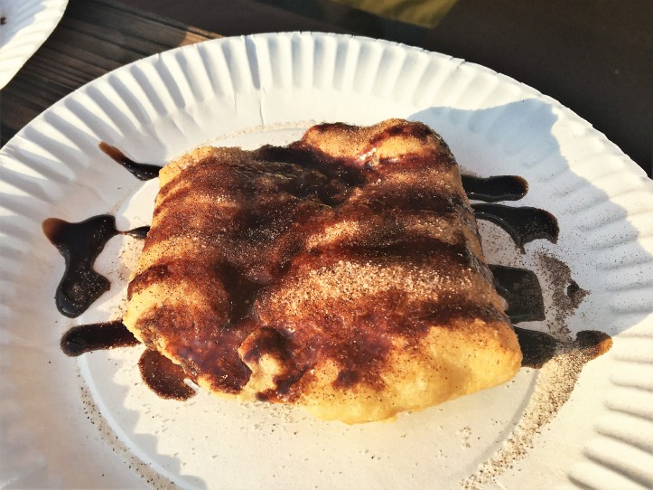 Short and sweet story: If you cannot pass up fried dough in any form, look no further than this lump of dough vaguely resembling a red blood cell, smothered in cinnamon sugar and laced with sauce. Don’t think of your arteries.