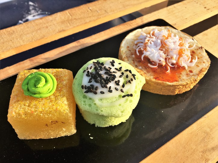 Short and sweet story: We adore tropical flavours, and South-East Asian desserts will always have a special place in our hearts. Moon Man’s sampler of three desserts was a delight – a green pandan cake, a chewier cassava cake cube, and a coconut-flecked tart/pancake hybrid.