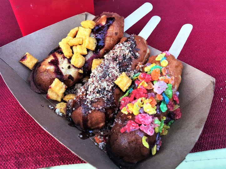 Short and sweet story: What looks like a corn dog, albeit covered in chocolate drizzle or cinnamon showers or rainbow-hued Fruity Pebble cereal, is served somewhat warm, tastes like a fluffy yet crispy waffle at first bite, and then a chewy mochi further in? A curious invention called a “Mochi Waffle.”