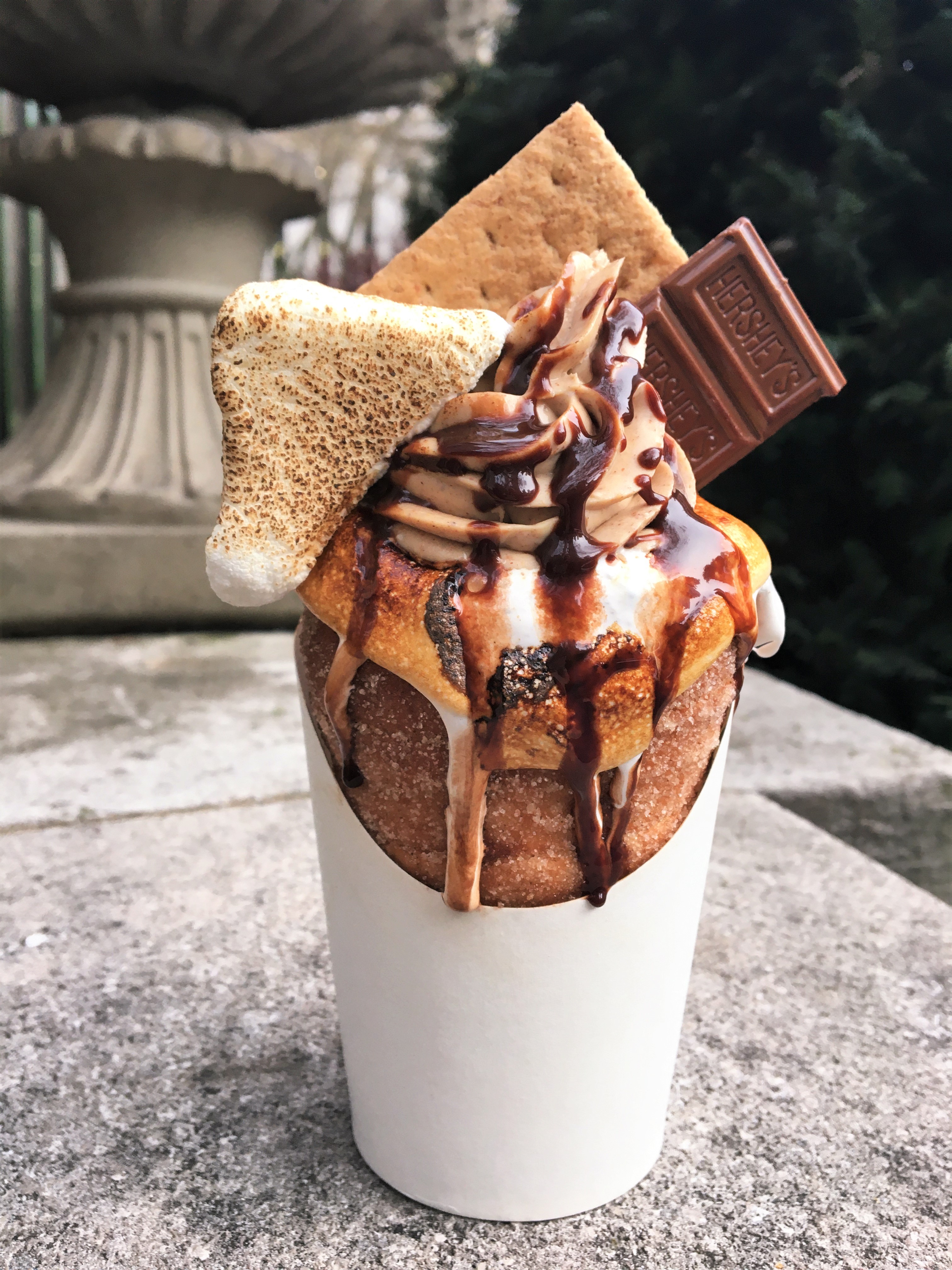 Short and sweet story: S’mores Chimney Cone ($15 + tax). If you have reached the end of this dessert review, you will be by now, in need of a complete sugar detox (and a fresh roll of dental floss). Wait, we have one more s’mores! For a few short weeks at the end of the year, the Stackery pops up in the centre of the Bryant Park Christmas Market, and offers a dessert that is commonplace during the Christmas Market season in Eastern Europe (see here). In this instance however, the Stackery has injected an over-the-top NYC edge into the dessert — completely crazy, screaming to be photographed, and utterly memorable…after about a 10 minute wait for it, so be patient! A cinnamon-dusted dough cone (more a doughnut-texture, than a churro) is filled with toasted marshmallow, swirled with Nutella, topped with ginger cheesecake whipped cream (we scooped this out), another marshmallow, graham crackers and the obligatory Hersey’s Chocolate mini-block. You will need 2-3 fellow dessert lovers to share this with you, and you will also probably need very strong apple cider or tea to wash it down. But, in our opinion, it is the only true way to welcome the Christmas season to NYC.
