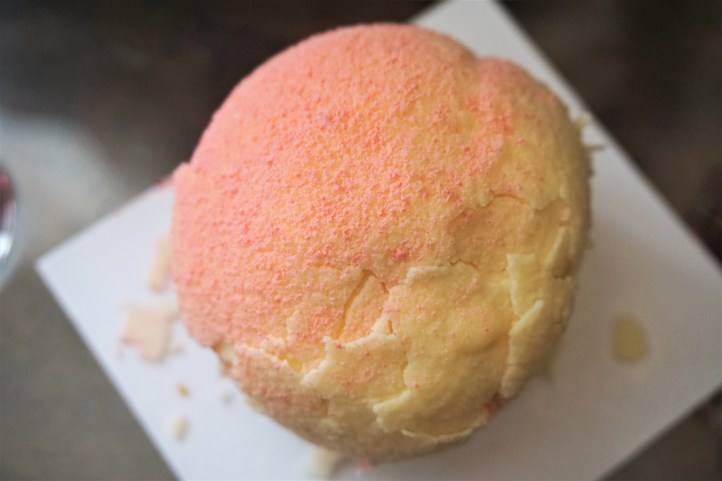 The other two LuxBite two cakes were made in the “trompe l’oeil” style that seems to be increasingly popular with pastry chefs across the globe (see e.g., our reviews of similar trompe l’oeil desserts in NYC here, and previously in another Melbourne patisserie here). The “Fortune Mandarin” ($10.88) was probably the lightest of the cakes, featuring vanilla white chocolate mousse, and a heart of yuzu mandarin compote. Although slightly squashed during our commute home, the “Longevity Peach” ($10.88) was a pretty pink ombre creation, of lemon mousse, hazelnut financier, white chocolate and apricot jelly.
