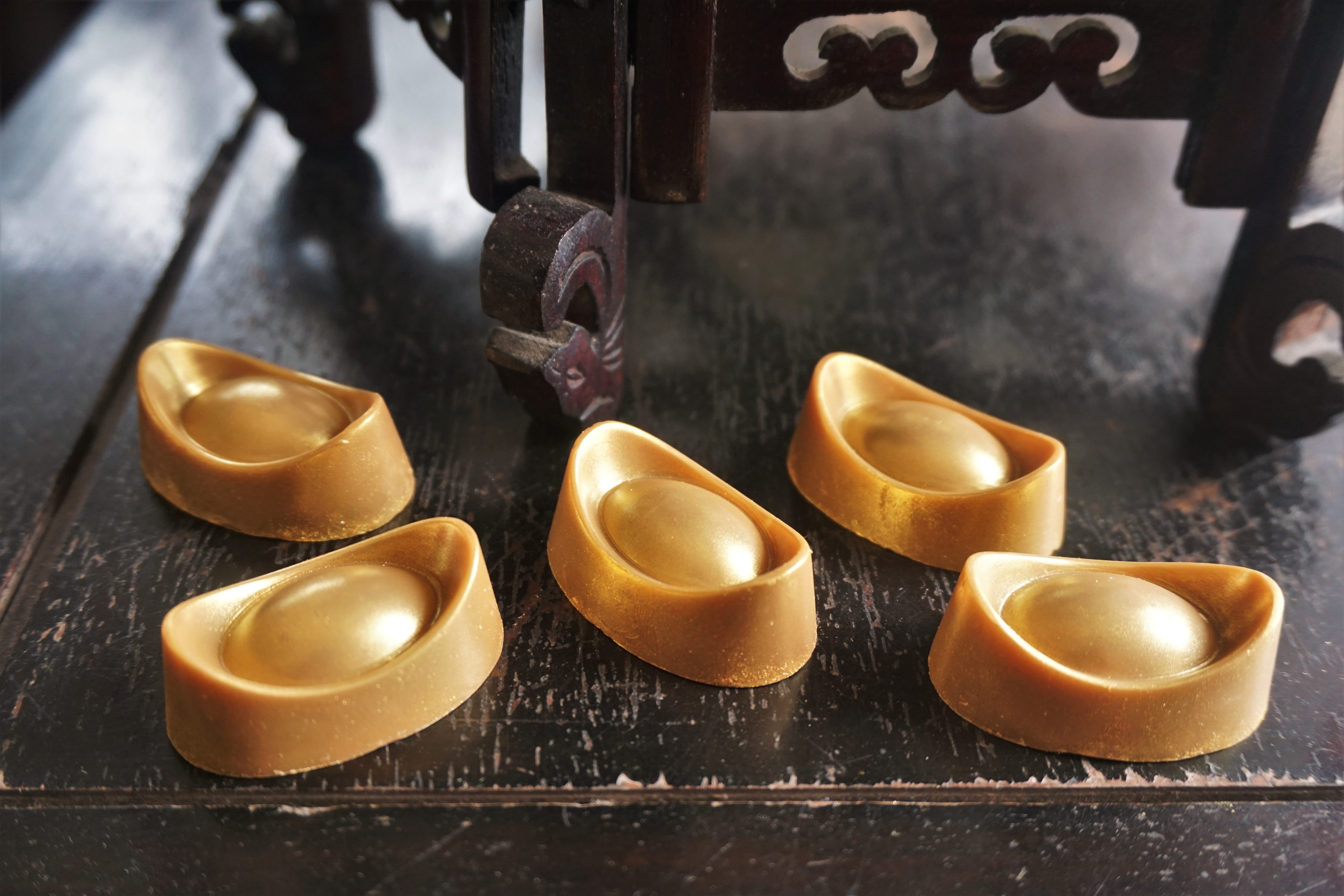 We also purchased LuxBite’s “Yuan Bao” ($2.38 each), little boat-shaped chocolate pieces, with muted caramel tones.