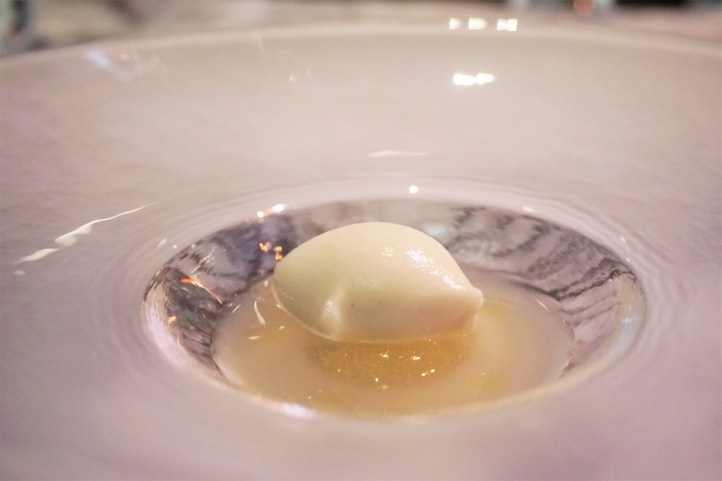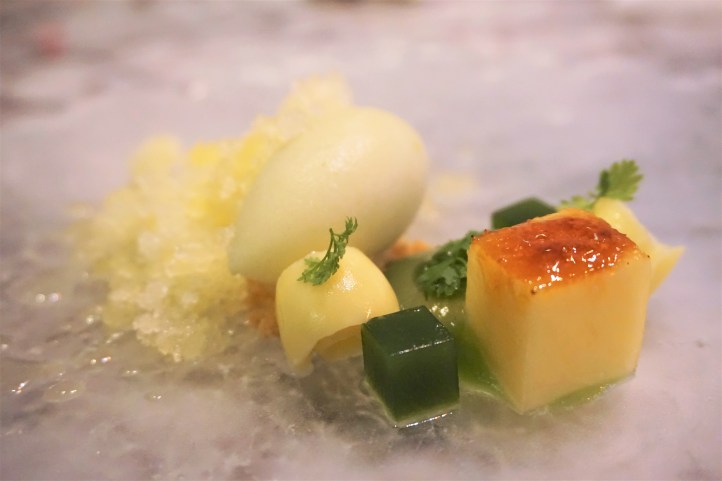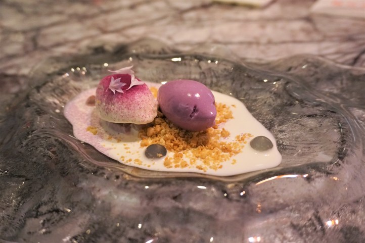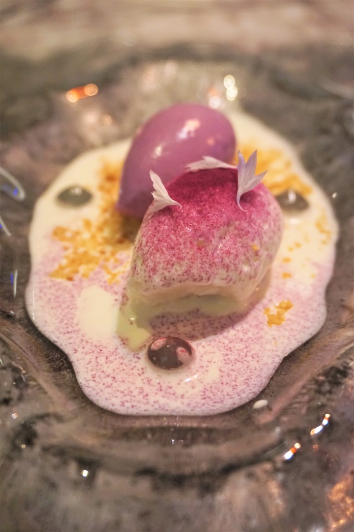 Reminding us of Cosme’s famous husked meringue dessert, Marble’s “Corn, Soba Cha, Milk” third course was perhaps our second favourite course of the dessert tasting. As a “savoury dessert” midpoint, it featured a fluffy spoonful of lightly-flavoured corn sorbet-cream atop crunchy pebbles. The fourth course featuring “Japanese Purple Potato, Fresh Cream, Longan” was perhaps, the most “Instagrammable” dessert. Beautifully plated, it resembled a glacier lake pooling between crystalline glass mountains. The tones of ube or “purple potato” here however, required more sensitive tastebuds than ours to detect. The fifth course of “Dulcey Chocolate, Banana, Yuzu” left us a little polarized as to compatibility – the chocolate and yuzu acted as ideal counter-weights to each other, but the quenelle of banana, we scooped that aside.