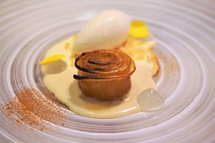 On our visit to Marble Dessert Bar one wintry weekend, the $75 per person “dessert tasting” menu started with an amuse bouche, a cremeaux-like creation with flavour tones of which we cannot recall. The first course — the “Pineapple, Apple, Basil, Lemon, Olive Oil” — was the most memorable of five courses served. Although the pineapple component of this dessert was in fact, a tiny cube of bruleed pineapple, the other components stole the show with their refreshing flavours and textures of sorbet, granita and jelly. The second course of “Fuji Apple, High Mountain Oolong, Maple” evoked the autumn season. Mirroring the concentric circles of frosted glass on which it was plated, the caramelized apple was presented here as a pretty swirl. We felt that this course required some texture crunch or crisp to give it an edge, though.