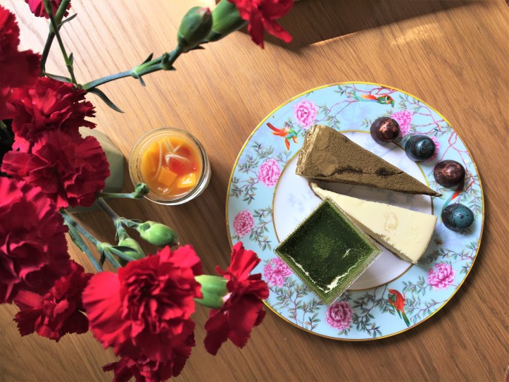 - 2 cakes: “Yuzu Cheesecake” and a “Hojicha Mille Crepe Cake.” The cheesecake had a texture somewhere between a dense American-style cheesecake, and a lighter Japanese-style cheesecake. The crepe cake was delightful, less creamy than your Lady M confection, and infused with the strong earthy and nutty tones of hojicha.