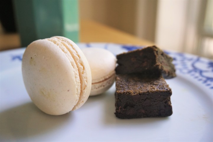 - Four petit fours: Not quite as memorable as the chocolate bites in our first box, our second box contained two blood orange macarons (a touch crunchy for our preference), and two small squares of hojicha fudge brownies.