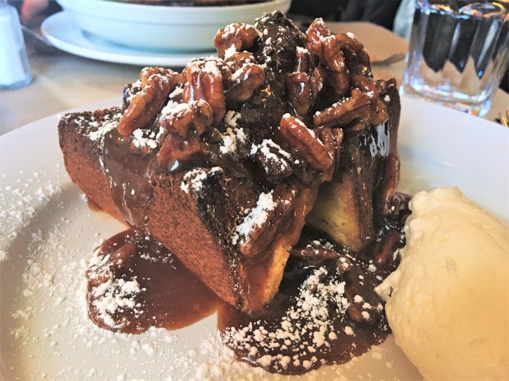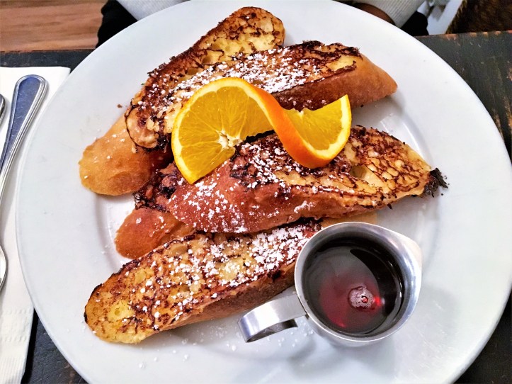 Short and sweet story: Orange Blossom French Toast. When brunching at Cafe Mogador, you might be tempted to go with the Middle-Eastern-accented savoury offerings, and we wouldn’t begrudge you that. But perhaps, as a dessert side, don’t overlook Cafe Mogador’s French Toast. It’s a “lighter” affair (certainly compared to the other French Toasts featured in this review below), with citrus wedges scattered on soft bread, and drizzles of orange blossom-scented maple syrup. You could possibly walk away from this breakfast dessert without much guilt at all. Sweet simplicity.