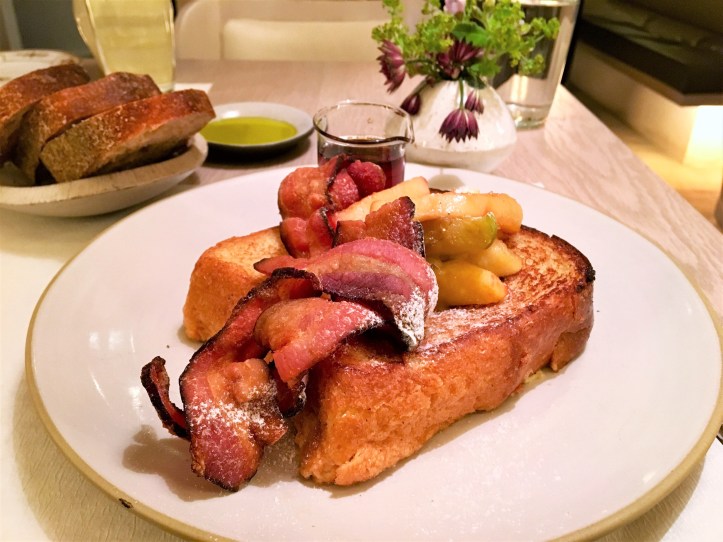Short and sweet story: Classical French Toast ($19+ tip/tax). As we no longer live in the vicinity, we don’t frequent uptown as much as we used to in our first year in NYC. It’s really only the changing seasons of pretty spring and fiery fall that lure us back to the area, and even then, mostly directly to Central Park. Yet, uptown has some real dessert gems – and affordable places too. Indeed, it’s not all $200+ pp Michelin-starred dinner places. JoJo is one such gem, exuding a “fancy dandy” air, yet still very accessible. We dined here for a casual weekend brunch with our girl gang, but it’s also that rare spot in NYC which your parents will love to visit. Indeed, we couldn’t help but smile (or smirk) a little when we saw quite a few dainty old Upper East Side ladies dressed in furs, pearls, block heels, and enviably-coiffed grey hair dotting a few tables. As for the brunch food options, you must not miss JoJo’s French Toast. It’s a classical interpretation – the French Toast itself is built like a brick, yet so luscious, oozing almost like a tres leche cake. It is festooned with curls of bacon spearing through a fortress of decadently caramelized apples.