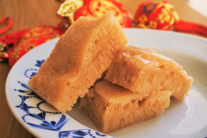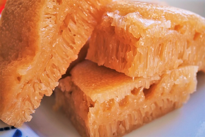 Made simply of rice flour, water and sugar mixed together and steamed, it’s difficult to describe the appearance of a Sugar Rice Cake. Sometimes, it reminds us of the foam that is created when waves crash on the shoreline. Other times, it’s as though someone carved out a section of a cave, complete with crystalline stalactites and stalagmites. It’s slightly sweet, moist and squishy. In Hong Kong and Guangzhou, a white or brown sugar version is more common, and has a slightly sour taste. In Vietnam and Malaysia, we have seen pandan and coconut versions, and because coconut milk is used, it has a comparatively sweeter profile.