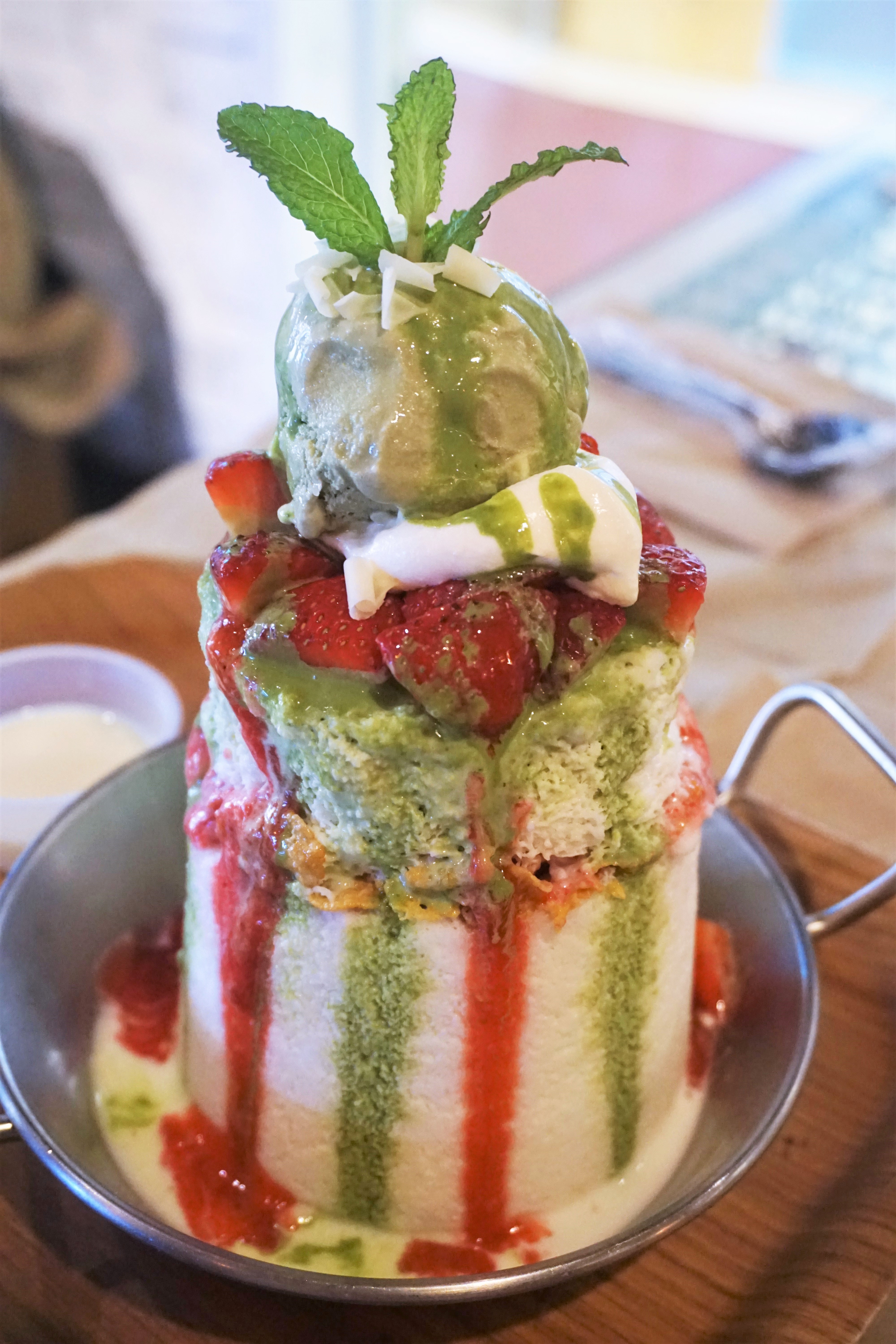 - Grace Street, Koreatown – There’s nothing graceful about Grace Street. Rather, the large cavernous space is rocking every hour of the day. It’s a great place for a group outing, and we have had many fun times there. But don’t come here for a quiet peaceful date night. Its Bubble Tea French Toast is memorable for a diabetic-inducing kick. And its meticulously layered shaved ice is an equally vertiginous feat of sugar feasting (and yes, you can actually see each layer of ice!). There are five flavours — matcha, strawberry, mango, cookie, and “OG” — and while it may be the least photogenic of the selection, you can’t go wrong with the traditional Korean classic. Savoury and nutty-flavoured, the “OG” is grey toned from black sesame, sprinkled with crushed sesame powder, and surrounded by a moat of sliced strawberry, mochi and red bean. The ice itself is very smooth, and strangely for shaved ice, very creamy.