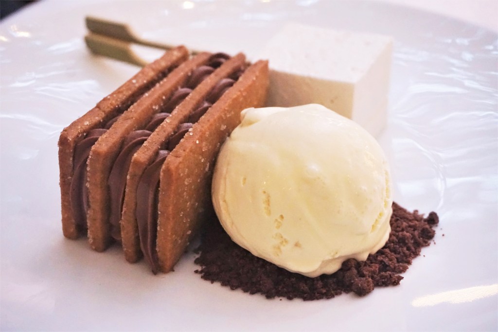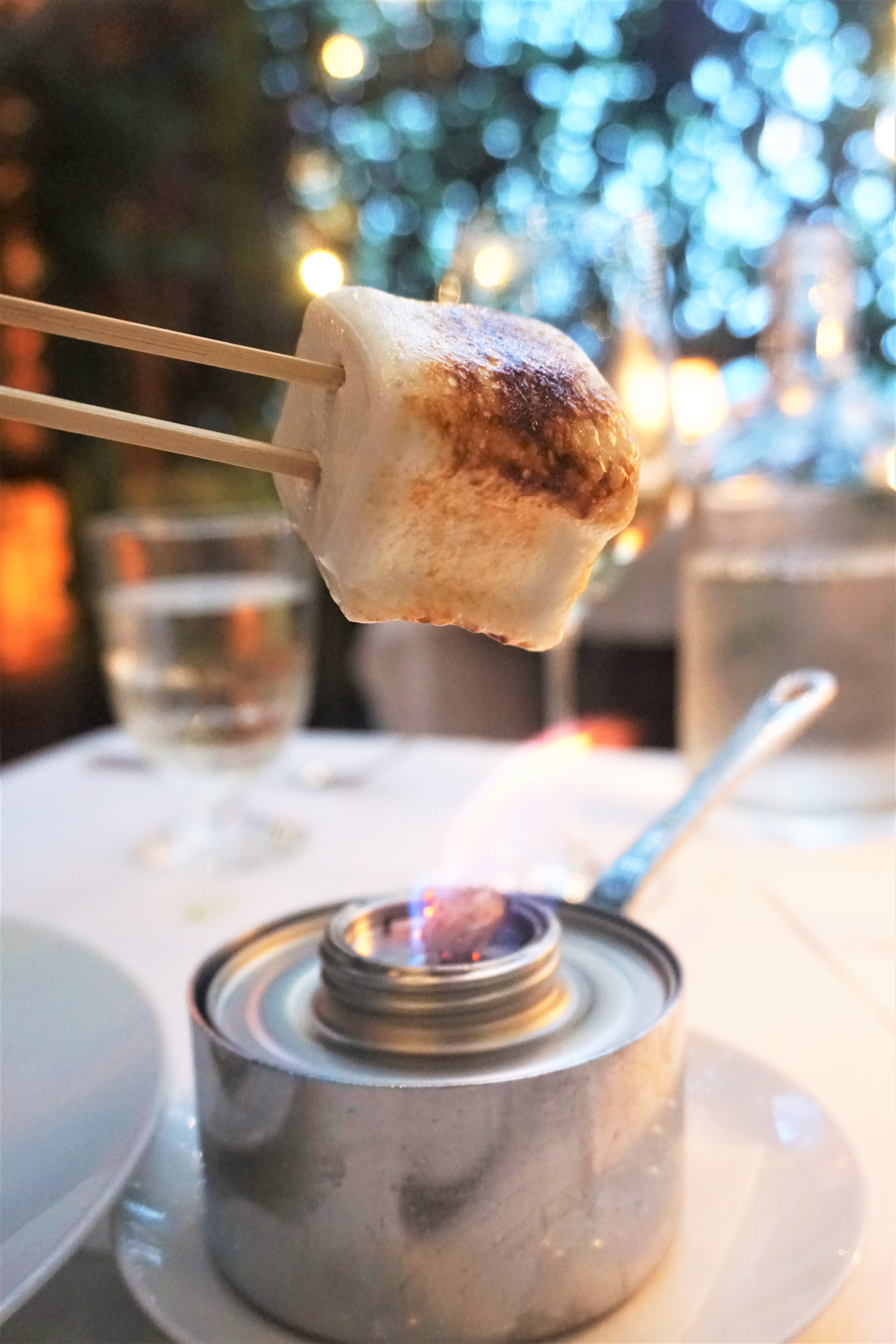 Short and sweet story: Although we generally avoid the Financial District in our leisure time as we work in the area, it is a district with no shortage of fabulous restaurants, offering some of the best desserts in the city: e.g., Crown Shy, Manhatta, Augustine, The Fulton, Delmonico’s. One of our favourite FiDi spots is the Beekman Hotel. Wrought in Art Deco-era architectural magnificence, this hotel holds a special place in our hearts because it opened the same year we arrived in NYC. You won’t find another hotel with such a beguiling array of antique furnishings, a breathtaking nine-storey glass atrium, and a bar room that feels like a time capsule of the gilded 1920-1930s decades. The piece-de-resistance is the restaurant on the top floor terrace, without a doubt, the most beautiful restaurant we have had the privilege of visiting in NYC. Dining at Temple Court on Ten is an ethereal dream-like experience: the space twinkles with fairy lights intermingled amongst the verdant cascades of wisteria, the staff seamlessly glide between the well-spaced tables, and the prix fixe 3-course menu (approx $150 pp after tax/tip) is elegantly and consistently executed, traditional European fare with touches of modernity. During our visit, there were two different desserts at the epilogue, one being a goblet of somewhat experimental corn mousse, and the other being a “S’mores” dessert. The latter featured four layers of cinnamon-infused crackers sandwiching luscious layers of molten dark chocolate. A playful DIY marshmallow roasting game, it makes for a rather memorable end to an anniversary dinner when the couple is given a chance to show each other who is better at torching marshmallows 😛