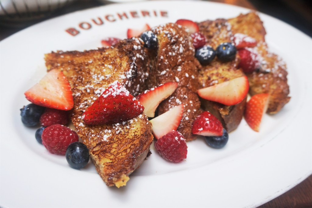 Short and sweet story: Berries ‘n’ Cream Challah French Toast ($16 + tip/tax). If you are tremendously hungry, or looking for a buzzy place for a group brunch, Maison Pickle (or its sibling, Jacob Pickle) is an excellent choice. The attitude here is bigger, louder, crazier. The music is thumping, the food portions are gargantuan, and boy, given the crowds, it feels as though the pandemic was a hundred years ago. There are a variety of French Toasts on offer, and you can choose between a tub of butter and a bottle of maple syrup simultaneously poured over your toast, a whole fried chicken squatting on top of it, or for the french toast that we ordered, a veritable mountain of whipped cream and berries. You only live once, right?