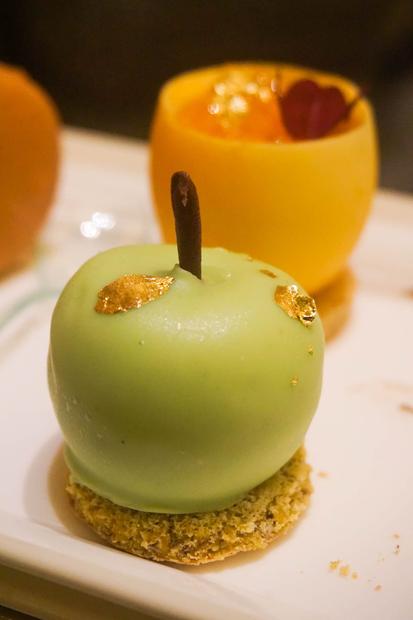 The uppermost tier of the high tea stand featured some of the most elegantly-crafted high tea sweets that we have had the pleasure of nibbling in NYC. The “Signature” tea set included a chestnut macaron; a berry fruit tart with yuzu lemon curd; a kalamansi banana cake; a trompe l’oeil apple creation with cloud-like mousse surrounding a caramelized apple centre; and a very memorable custard egg with red tea and mandarin jelly and a touch of mango. The “Mrs. Maisel” set consisted of a macaron spliced in black and white (seemingly to mirror the city’s iconic black & white cookie); a little tart with pomegranate jelly; a pink strawberry creme mousseline creme puff; a rich chocolate nutella babka cheese; and a zinging yuzu lemon meringue tartlet. Scones were served warm, wrapped in a thick white napkin. They were accompanied with properly luscious Devonshire cream, yuzu lemon curd (our favourite!), and strawberry preserve.