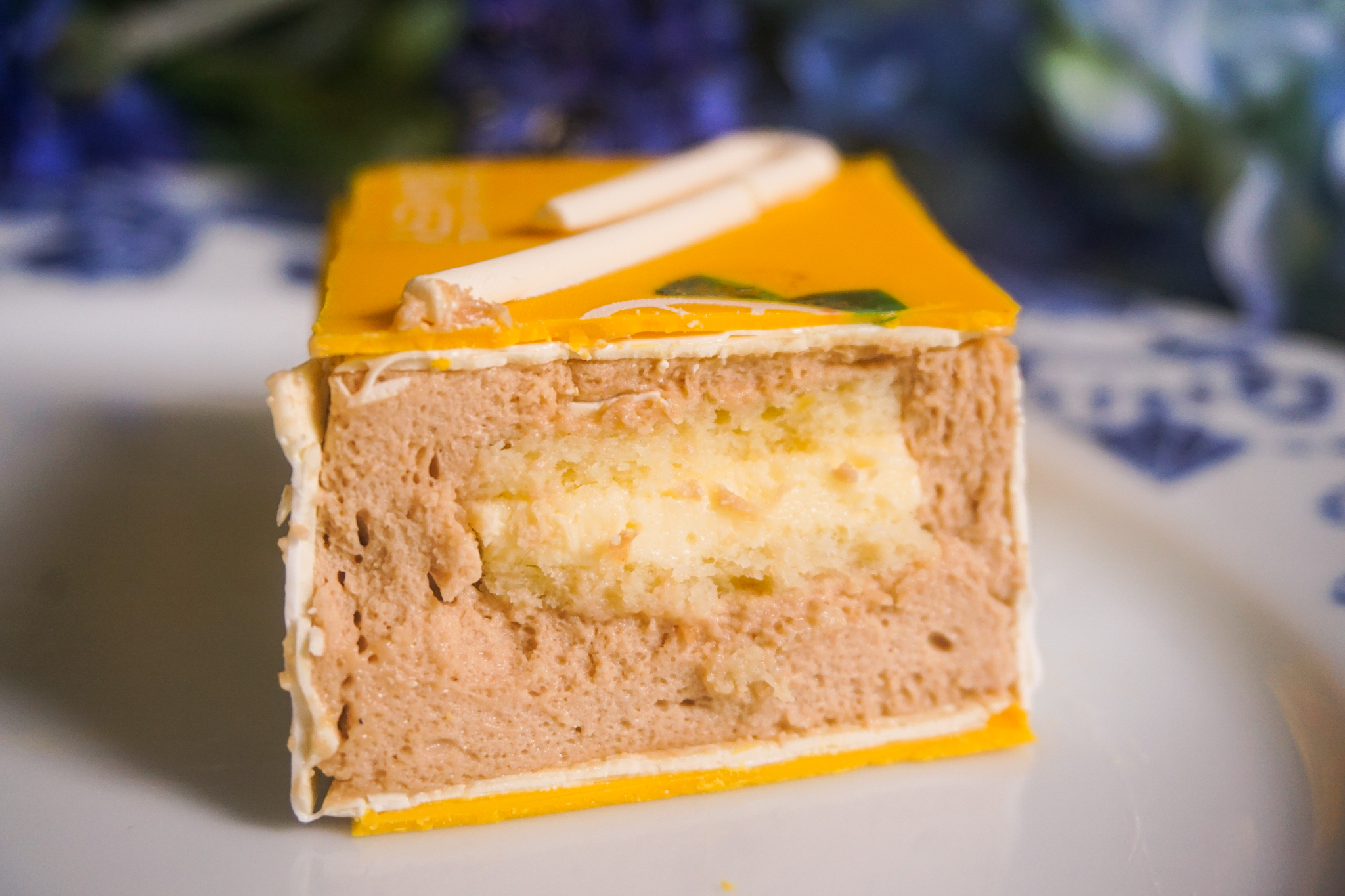 - “Hong Kong Lemon Tea Juicebox” — sitting on an almond biscuit base and covered with imprinted white chocolate, this was a rectangular block of very lightly-infused Earl Grey mousse, with a centre of bergamot lemon curd.